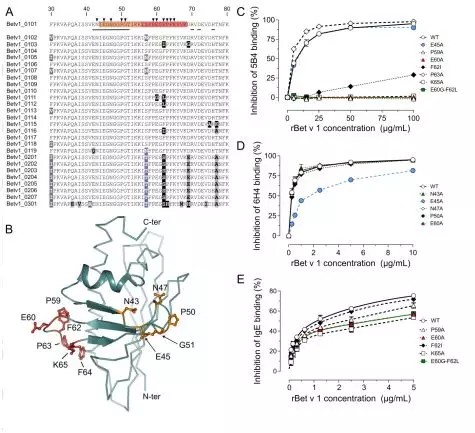 Results: The 5B4 epitope corresponds to a peptide sequence (I56-K68) overlapping with the binding sites of patients’ serum IgEs. Mutation of residues P59, E60 and K65 abolishes 5B4 binding to Bet v 1 and reduces the level of IgE recognition. In contrast, 6H4 recognizes a conformational epitope lying opposite to the 5B4 binding site, involving residues located in segments I44-K55 and R70-F79.Substitution of E45 reduces the binding capacity of 6H4, confirming that it is critical for the interaction. Both mAbs interact with >90% of Bet v 1 content present in the birch pollen extract,while displaying a weak cross-reactivity with other allergens of the PR-10 family.