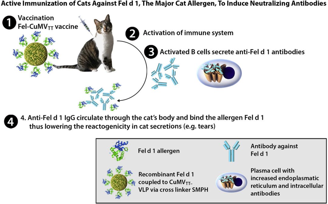 Cat allergy in human subjects is usually caused by the major cat allergen Fel d 1 and is found in approximately 10% of the Western population. Currently, there is no efficient and safe therapy for cat allergy available. Allergic patients usually try to avoid cats or treat their allergy symptoms.