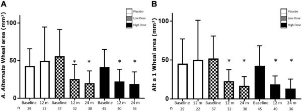 There were significant reductions in the combined symptom and medication score for the 0.37-μg dose of Alt a 1 compared with placebo at 12 months of treatment. Reduced cutaneous reactivity and IgE levels, together with increased IgG4 levels, were demonstrated for the 2 active groups versus the placebo group. A similar safety profile was found for both active groups compared with the placebo group. No serious adverse drug reactions were reported.