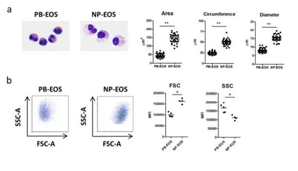 方法:我們建立了一種從嗜酸性鼻竇炎(NP-EOS)患者鼻息肉中分離CD69hi CCR3low CXCR4- siglec-8int 嗜酸粒細(xì)胞的方法,并與健康受試者外周血來(lái)源的嗜酸粒細(xì)胞(PB-EOS)進(jìn)行脂質(zhì)組學(xué)、蛋白質(zhì)組學(xué)和轉(zhuǎn)錄組學(xué)的多組學(xué)分析,以分析NP-EOS。