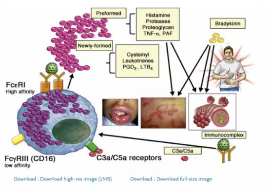 IgE介導(dǎo)通路由過敏原啟動,當(dāng)過敏原與特異性IgE抗體結(jié)合時,導(dǎo)致肥大細胞(MC)和嗜堿性細胞上的高親和性IgE受體(FcεRI)發(fā)生交聯(lián)并啟動信號級聯(lián),釋放包括組胺在內(nèi)的介質(zhì),以及預(yù)形成的細胞因子和蛋白酶,以及合成和分泌額外的細胞因子和脂質(zhì)介質(zhì),如血小板激活因子(PAF)、白三烯和前列腺素。典型的過敏反應(yīng)途徑是適應(yīng)性免疫的一個例子。對過敏原過敏反應(yīng)的臨床診斷是基于這種IgE范式的。當(dāng)使用免疫調(diào)節(jié)治療(如免疫療法或抗IgE)時,對特定過敏原的IgE水平高與疾病嚴(yán)重或持續(xù)時間長有關(guān),也與治療失敗有關(guān)。然而,有相當(dāng)一部分經(jīng)歷過過敏反應(yīng)的患者并沒有出現(xiàn)IgE依賴性免疫激活的任何證據(jù)。在這些患者中,沒有跡象表明IgE介導(dǎo)的MC或嗜堿性粒細胞激活,如皮膚試驗陽性結(jié)果、存在過敏原特異性IgE或組胺升高。在一些患者中,根本沒有MC激活的證據(jù),例如,他們有正常的胰蛋白酶。所有這些數(shù)據(jù)表明存在其他潛在的機制。