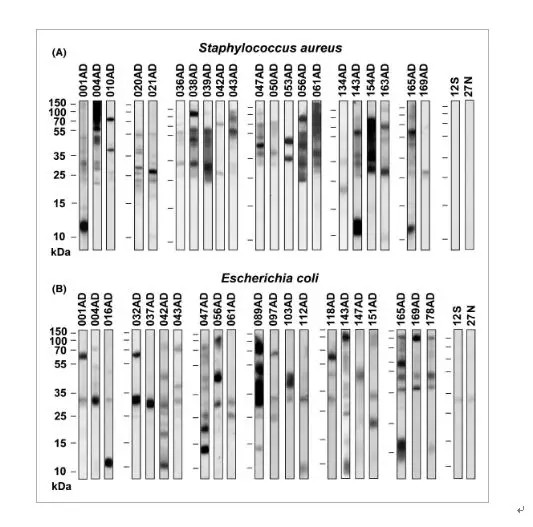 用IgE免疫印跡法對179例AD患者血漿標本進行微量屋塵螨變應(yīng)原分子及金黃色葡萄球菌和大腸桿菌抗原的IgE反應(yīng)性分析。檢測金黃色葡萄球菌和大腸桿菌抗原特異性抗體與印跡在硝酸纖維素膜上的來自純化的屋塵螨個體的提取液的反應(yīng)性,并通過IgE免疫印跡抑制實驗檢測IgE-反應(yīng)抗原。針對屋塵螨中細菌抗原的IgE抗體通過 IgE ImmunoCAP?抑制試驗來定量。